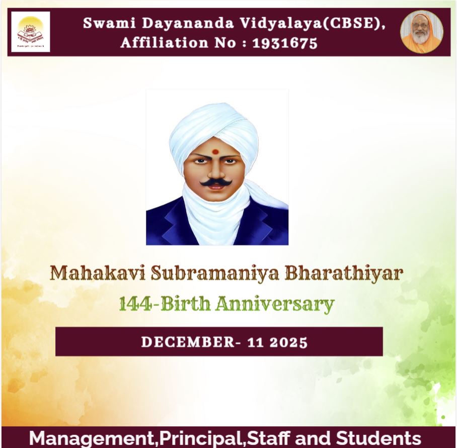 Swami Dayananda Vidyalaya (CBSE), Manjakkudi, proudly celebrated the Birth Anniversary of Mahakavi Subramania Bharathiyar on 11th December 2025 with great enthusiasm and patriotic fervour. The event was organized to inspire students by highlighting the poet’s life, literary brilliance, and remarkable contributions to India’s freedom struggle. The day began with a special morning assembly, during which a Bharathiyar song was played in place of the regular march-past music, creating an atmosphere filled with reverence and motivation. Students of Grade 2 rendered the soulful Bharathiyar song “Odi Vilayadu Papa”, capturing the true spirit of the celebration. Students of Grade 9 actively participated by delivering speeches in both Tamil and English, emphasizing Bharathiyar’s literary excellence, his fearless nationalism, and his advocacy for women's empowerment, education, and social equality. Their presentations reflected the poet’s progressive thoughts and patriotic ideals. To commemorate the occasion, a special poster showcasing Bharathiyar’s legacy was designed and shared on the school’s official social media platforms and website, ensuring wider visibility and engagement. The celebration served as a meaningful reminder of the timeless impact of Bharathiyar’s writings and successfully instilled patriotic values among the students.