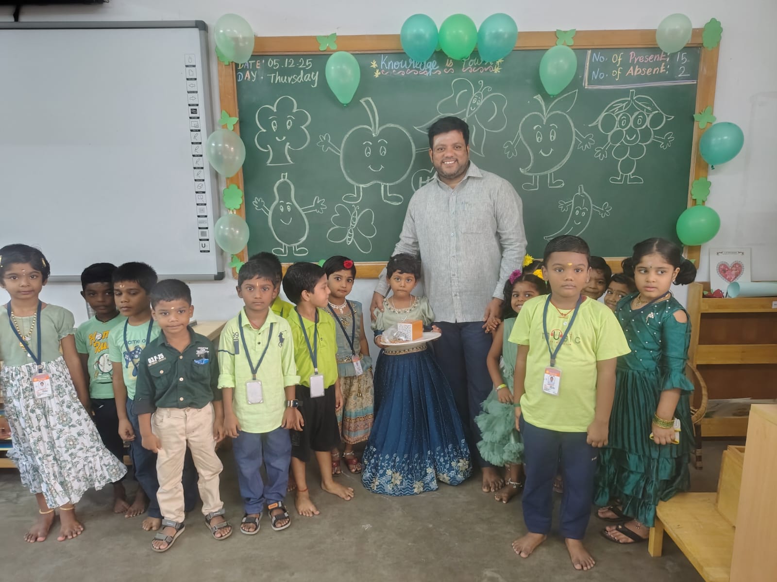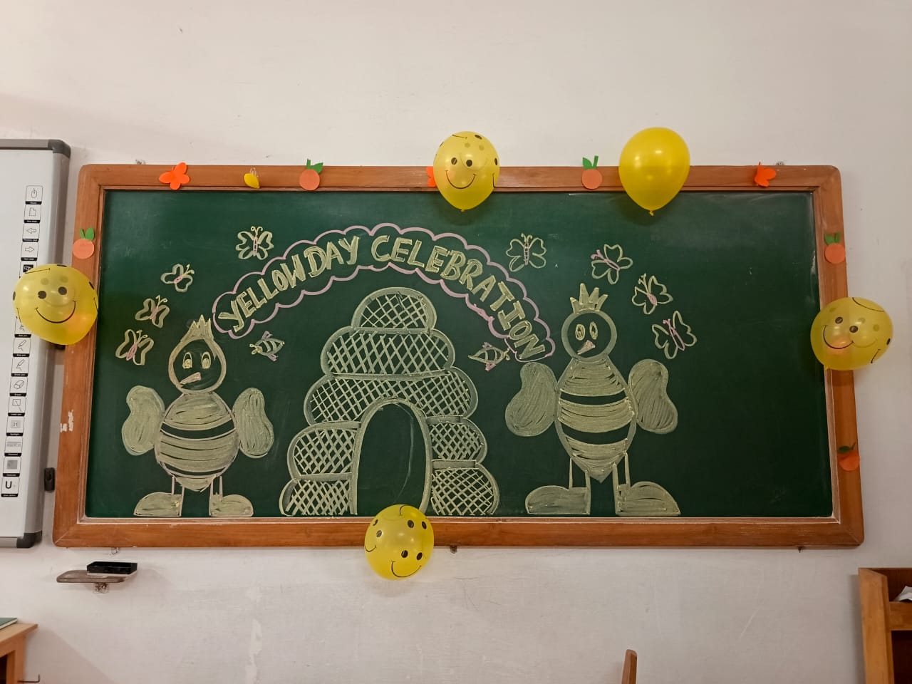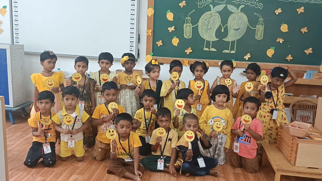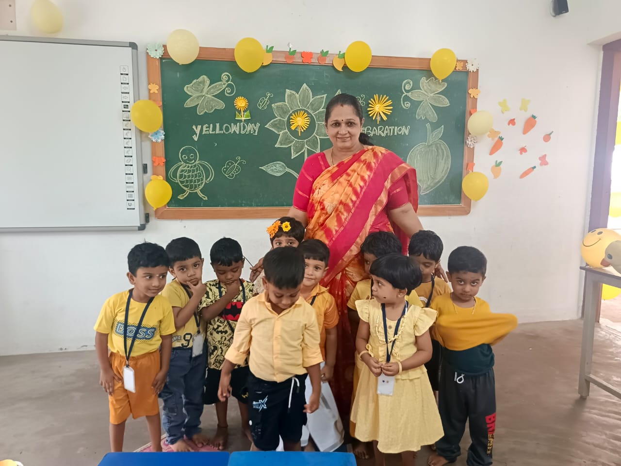 Yellow Day Celebrations – Montessori Department Date: 19.09.2025 (Friday) Venue: School Campus The Montessori Department joyfully celebrated Yellow Day on Friday, 19th September 2025, in the vibrant and festive school campus. The event aimed to help children recognize and appreciate the color yellow and its significance in the world around them. The entire campus was beautifully decorated in various cheerful shades of yellow, creating a bright and lively environment for the young learners. To add to the spirit of the day, all the teachers wore yellow-colored attire, enhancing the thematic experience for the students. Each class participated in engaging, age-appropriate activities that fostered creativity, sensory exploration, and fine motor skills: M0 (Pre-KG): The little ones enjoyed a fingerprint activity on mango craft, creating their own suns using yellow paint and discovering the joy of learning through play. M1 (LKG): Children in M1 took part in a buds print activity on mangoes, designing cheerful smileys that reflected their energy and happiness. M2 (UKG): The M2 students engaged in a buds print activity on pineapple craft, crafting adorable honey bees as part of their exploration of yellow-themed objects. In addition to class-wise activities, an EVS coloring and drawing activity was conducted for all Montessori students, further reinforcing the theme of the day through creative expression. The Yellow Day celebration was a vibrant and joyful event filled with laughter, learning, and hands-on fun. It left all the children beaming with excitement—just like the color yellow itself!